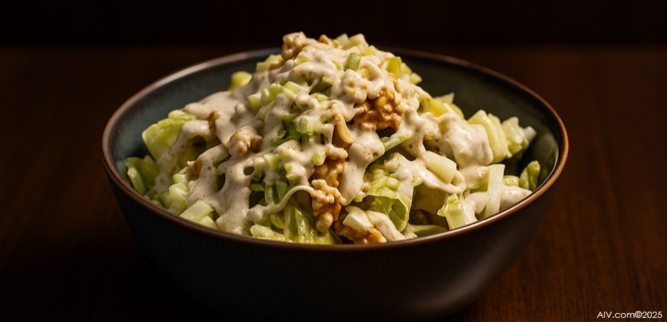 ⌂ | Nota previa: También podemos utilizar tiras de apio en conserva. | ⌂ | Nota previa: Si las nueces no están tostadas las pasaremos ligeramente en la sarten. | 01. | La acidez de la manzana Granny Smith le va muy bien a la ensalada, pero si te gusta darle un toque más dulce puede utilizar manzana Golden. | 02. | Mezclamos la mayonesa con un chorro de vinagre y reservamos. | 03. | Pelamos las manzanas y cortamos en dados, el apio en trozos pequeños. | 04. | En la fuente de servicio ponemos una cama de lechuga (previamente lavada y troceada) y encima el apio, las manzanas, las mitad de las nueces, las pasas y la mayonesa con el vinagre y finalmente decoramos un el resto de las nueces. |